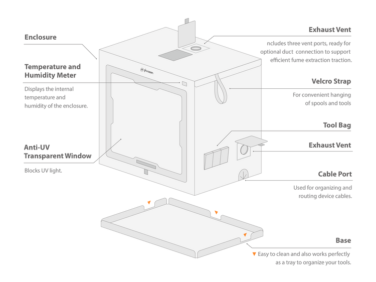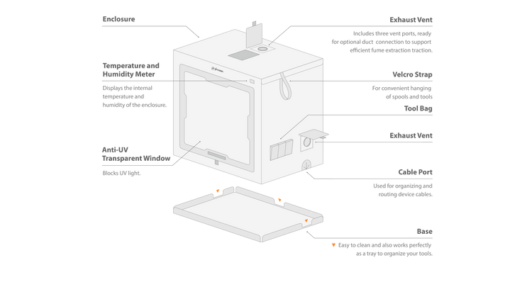 Unlike most enclosures on the market, it features a removable base that’s easy to take out and clean — and it also works perfectly as a tray to organize your tools, making your 3D printing setup more practical and flexible.