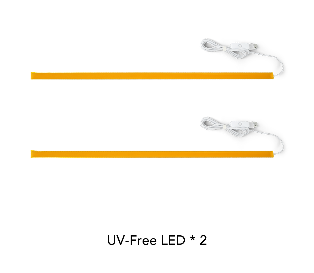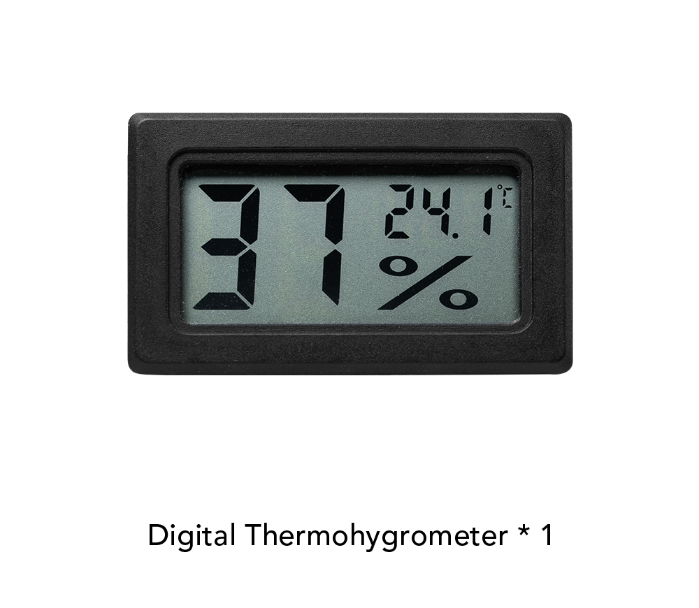 Built-in thermo-hygrometer ×1, Exhaust ports ×3, Cable holes ×3, Hook-and-loop straps (Inside ×8 / Outside ×2), Tool pouches ×2 sets, UV-Free LED strips ×2 - Battery: LR44 ×2 (included)