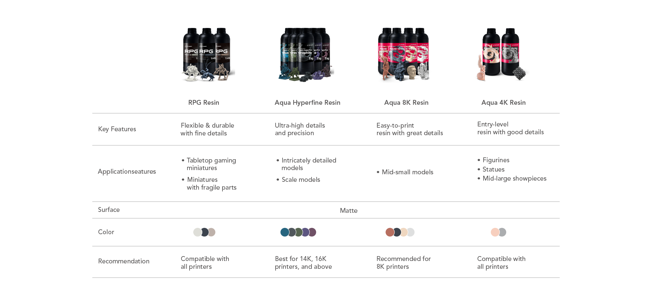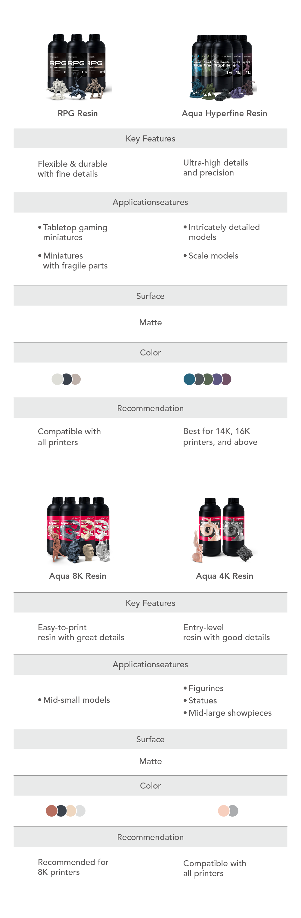 Explore our high-resolution resin range—from intricate details to exceptional tabletop durability. Our guide with scale indicators helps you choose the ideal resin for creative, practical projects.