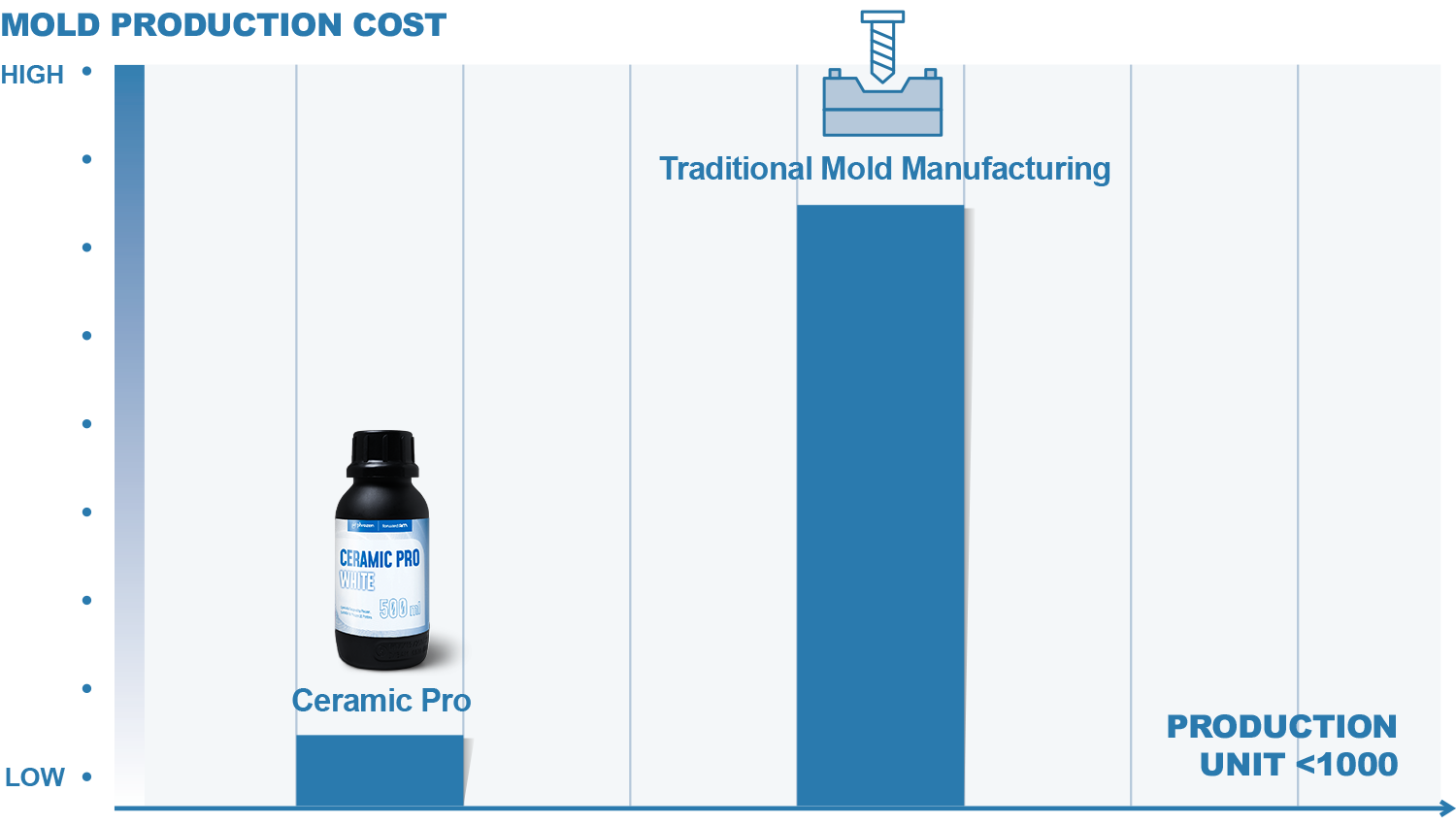 By eliminating high MOQ requirements, long lead times, and extensive tooling costs typically associated with manufacturing, Ceramic Pro Resin reduces mold production time from weeks to under a day while saving up to 80% of production costs.