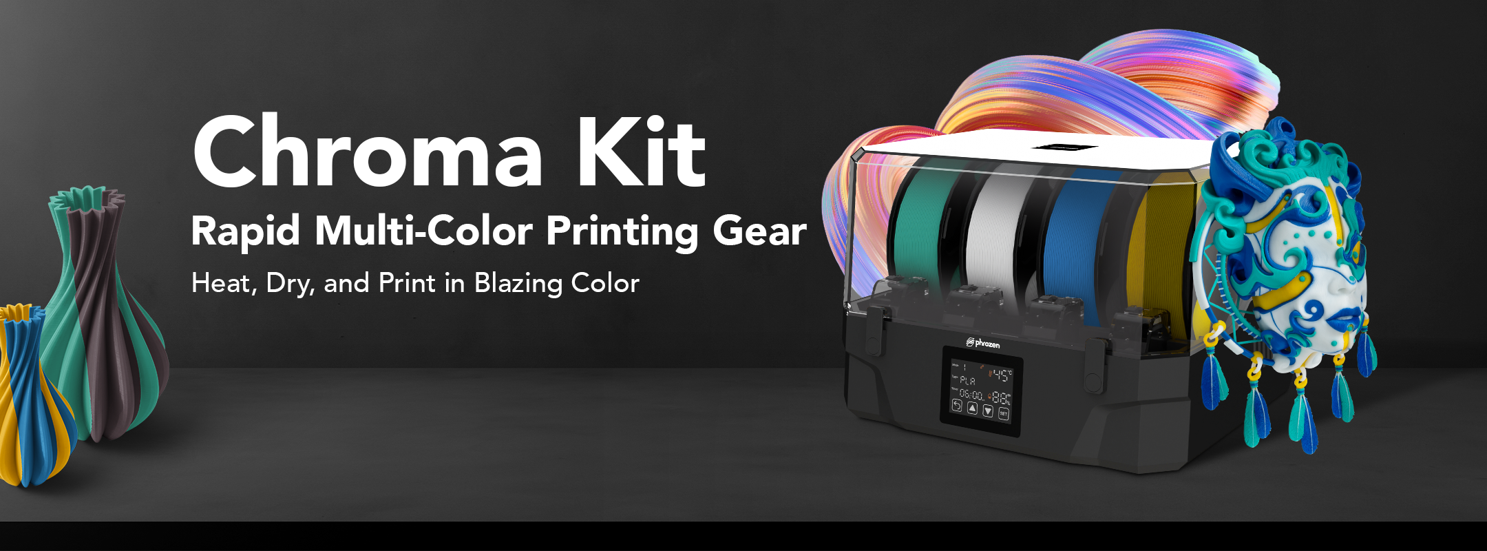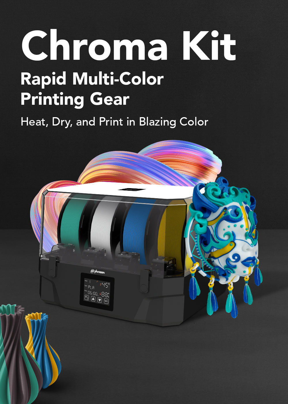 Say goodbye to brittle, moisture-damaged prints. Chroma Kit heats filament to 70°C, removing humidity to ensure better flow, enhanced layer adhesion, and a smooth surface finish even during long prints.