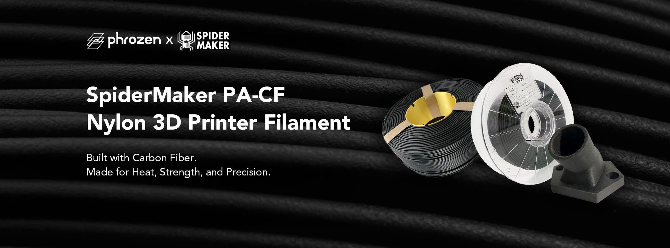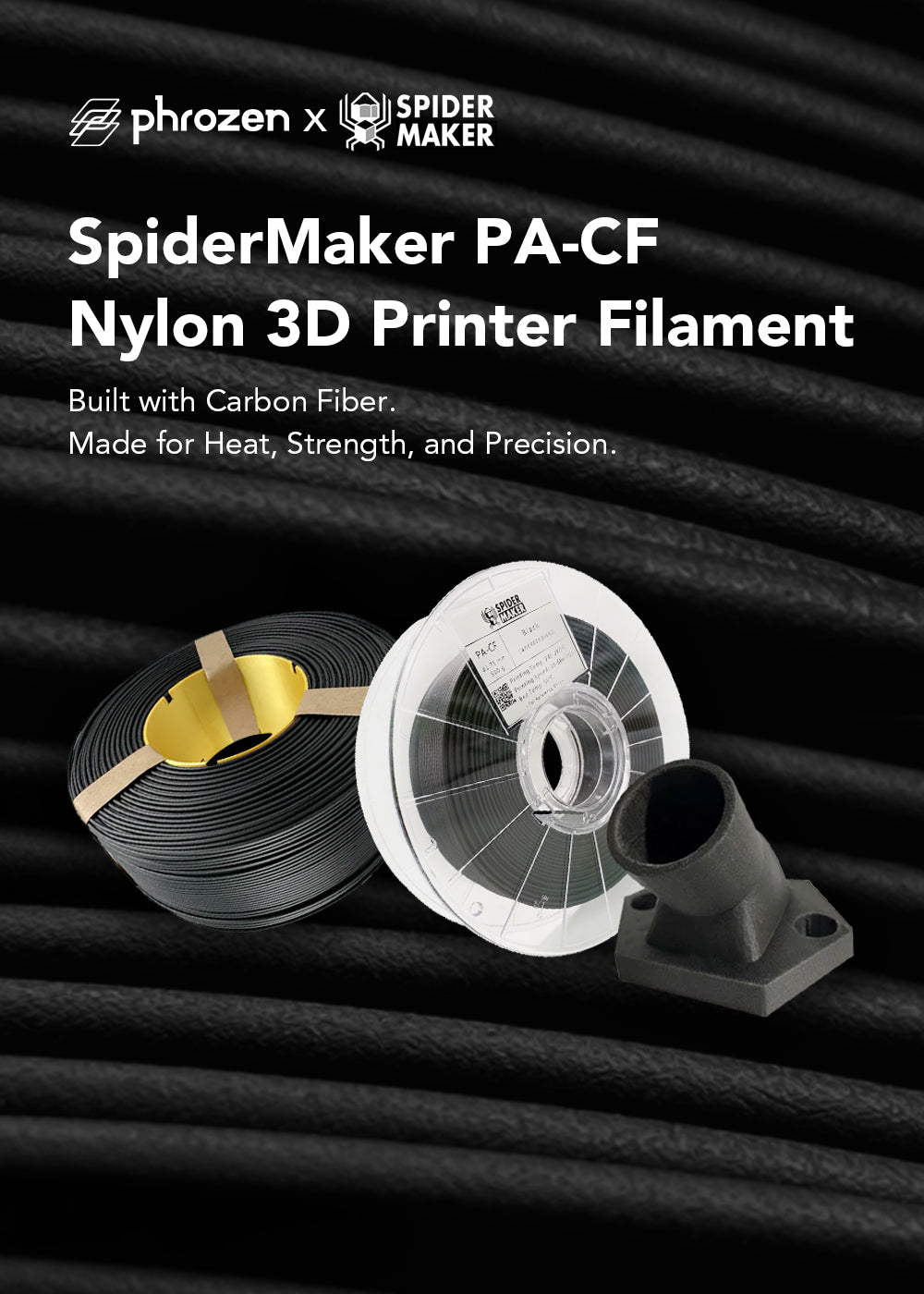 SpiderMaker PA-CF blends 80% low-temp nylon with 20% carbon fiber for smooth, stable prints at just 240–260°C — no special setup needed.