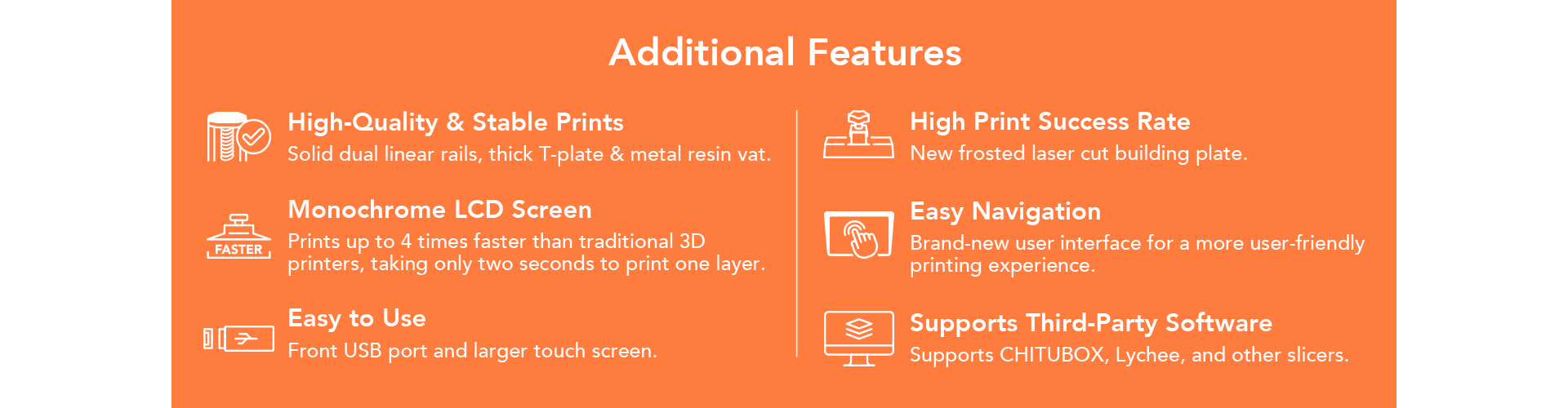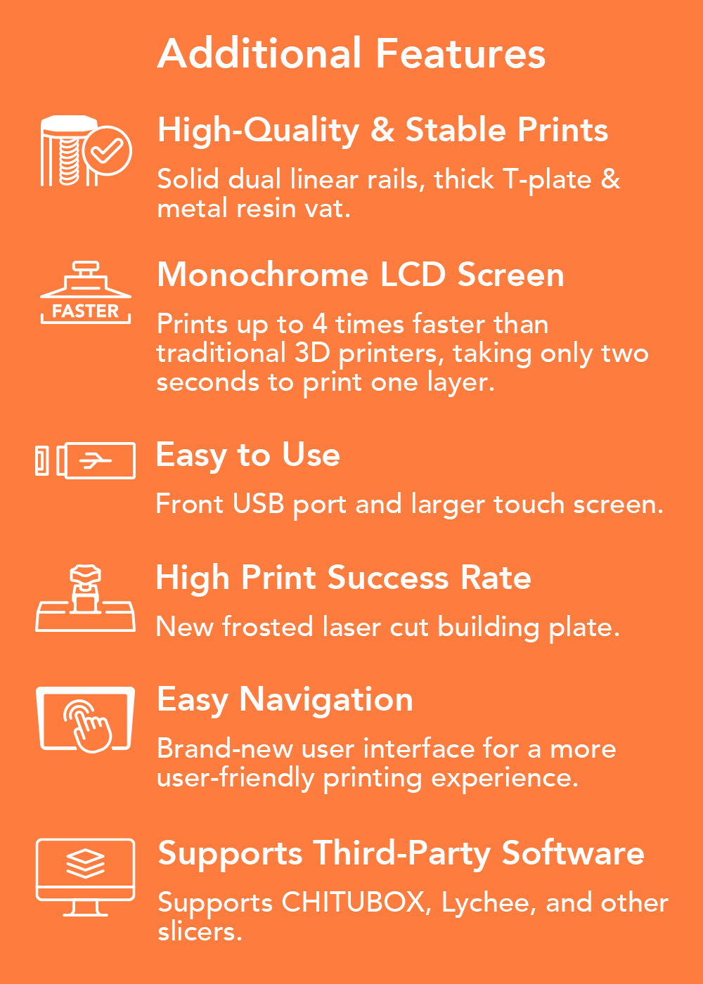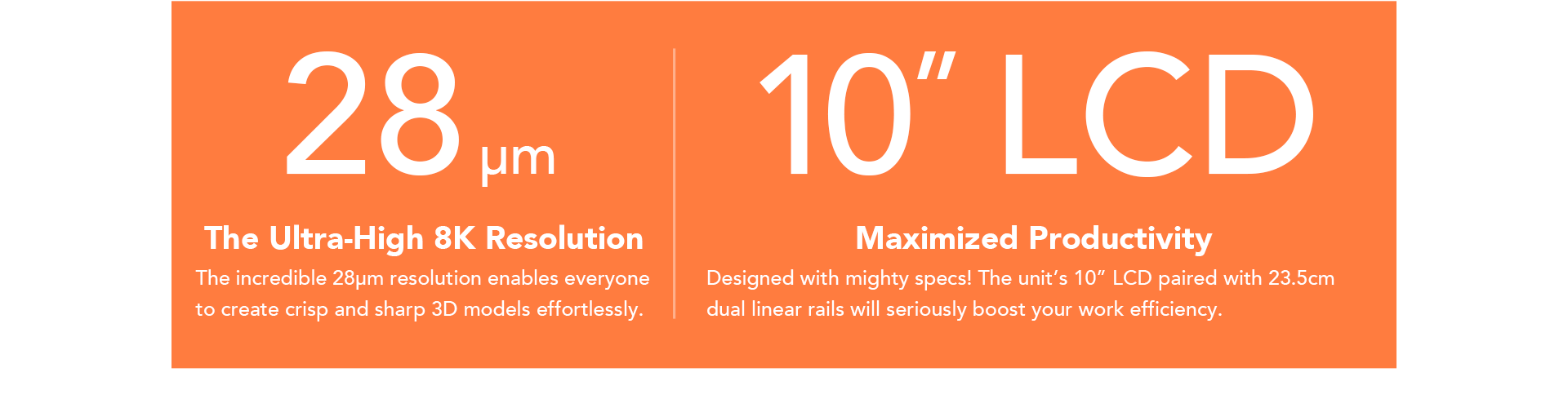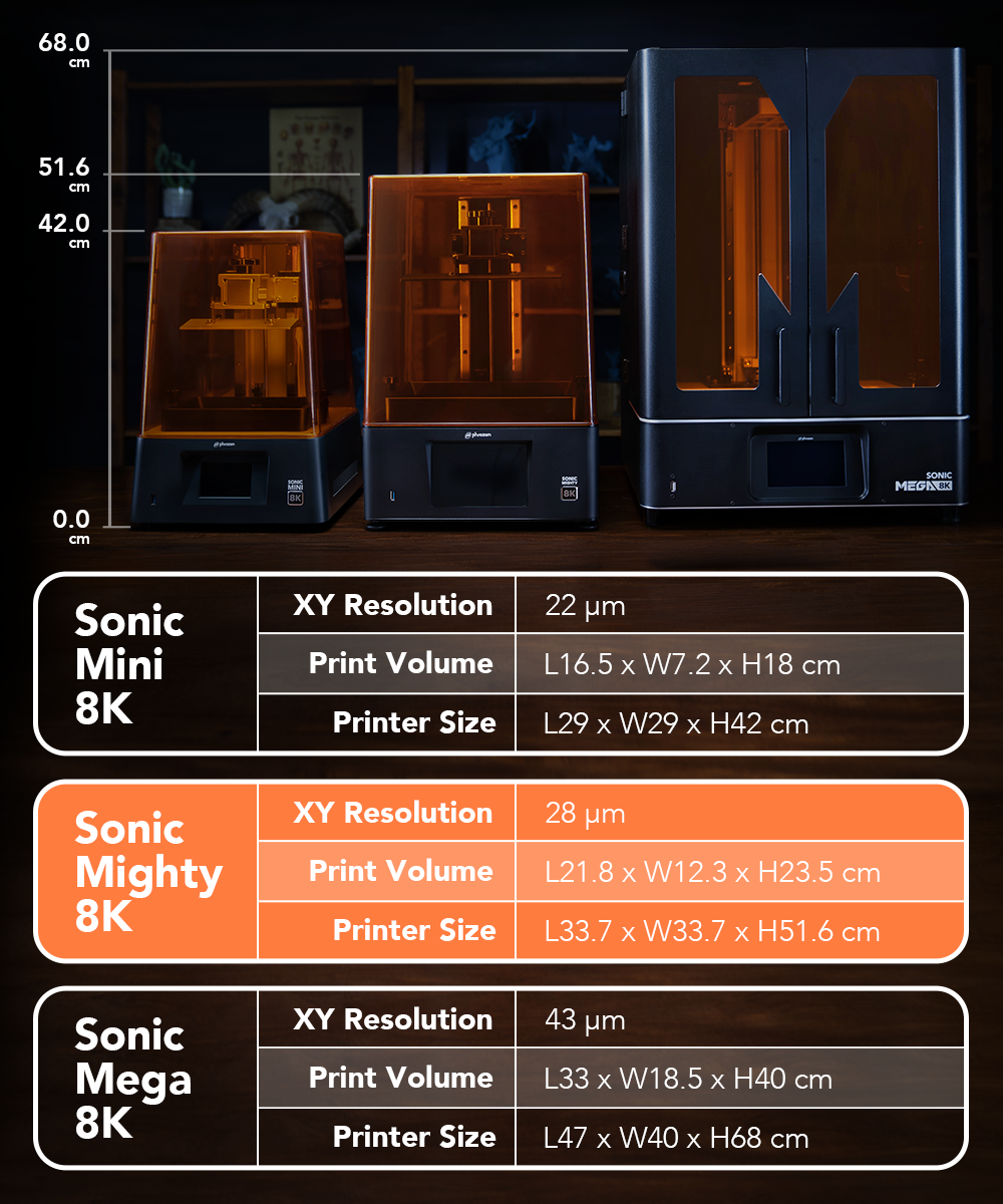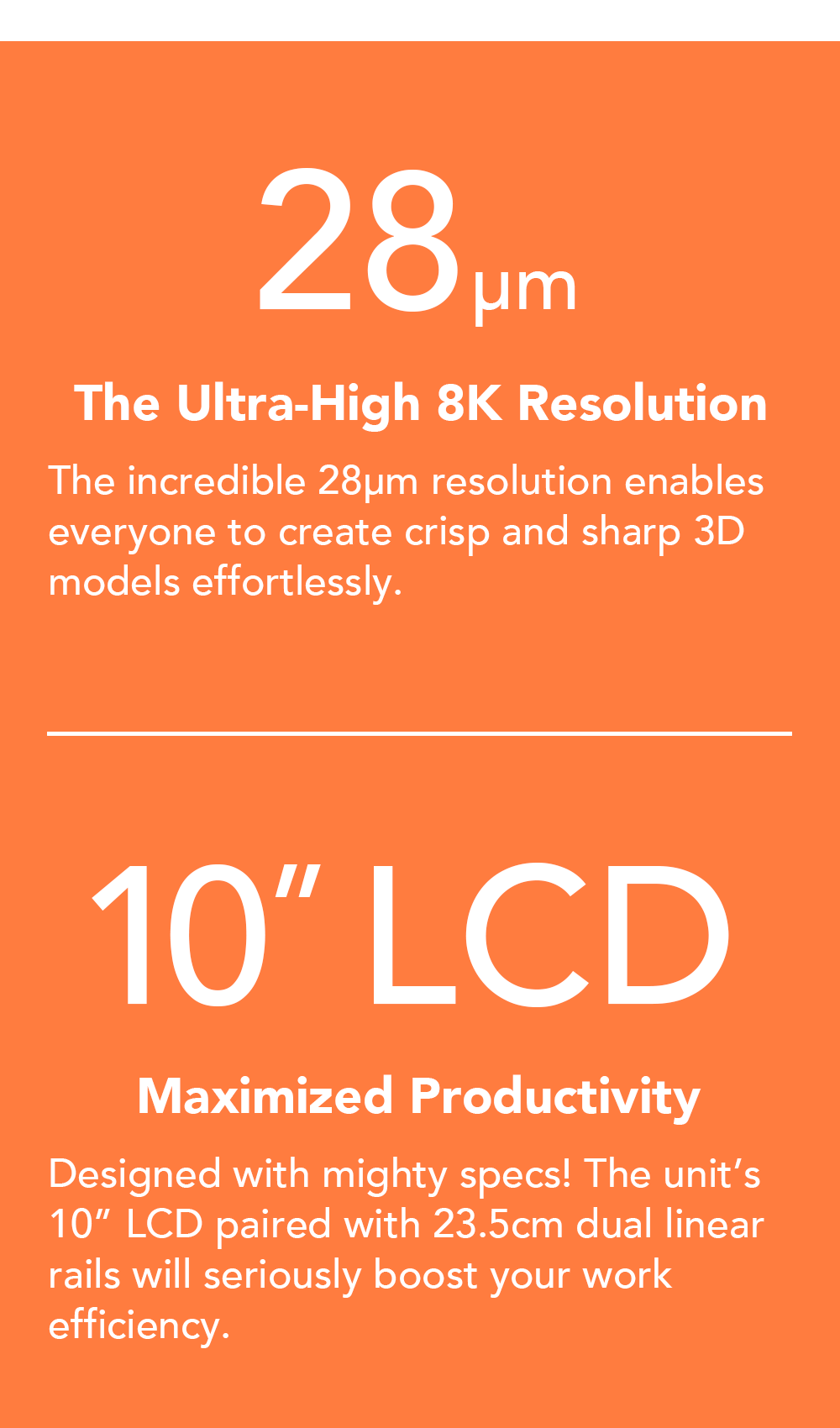 Tired of sacrificing details every time you want to print big? Or are you spending way too much time printing out pieces to assemble into one giant model? With Sonic Mighty 8K, these problems are history. Perfectly balancing compact size with improved productivity, Sonic Mighty 8K allows you to mass-produce all your models with ultra-high 8K resolution, regardless of size or scale! What’s more, the intuitive design of Sonic Mighty 8K makes it suitable for everyone—even beginners!