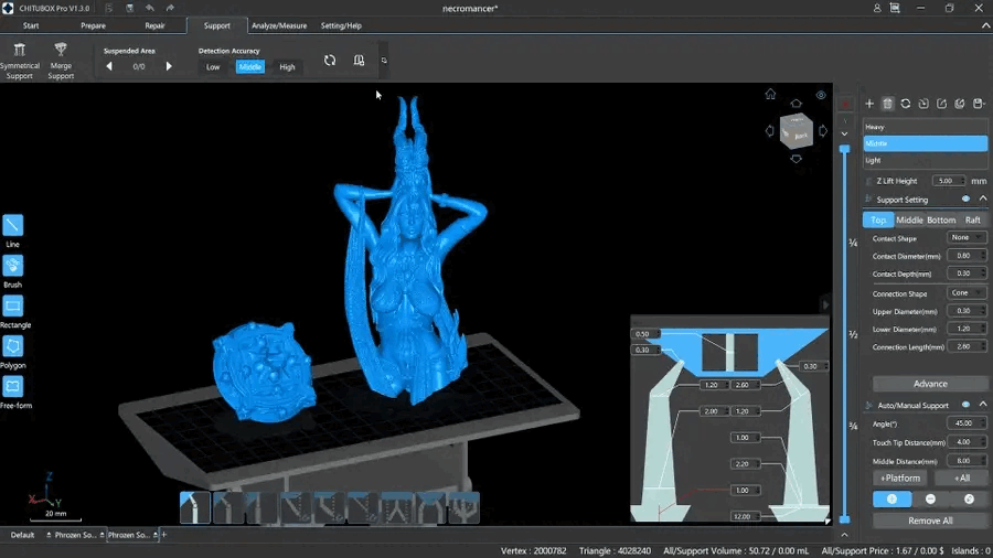 CHITUBOX Pro 會偵測懸浮區域並智慧添加支撐。可以輕鬆刪除具有自訂參數的可編輯支撐以保留細節。